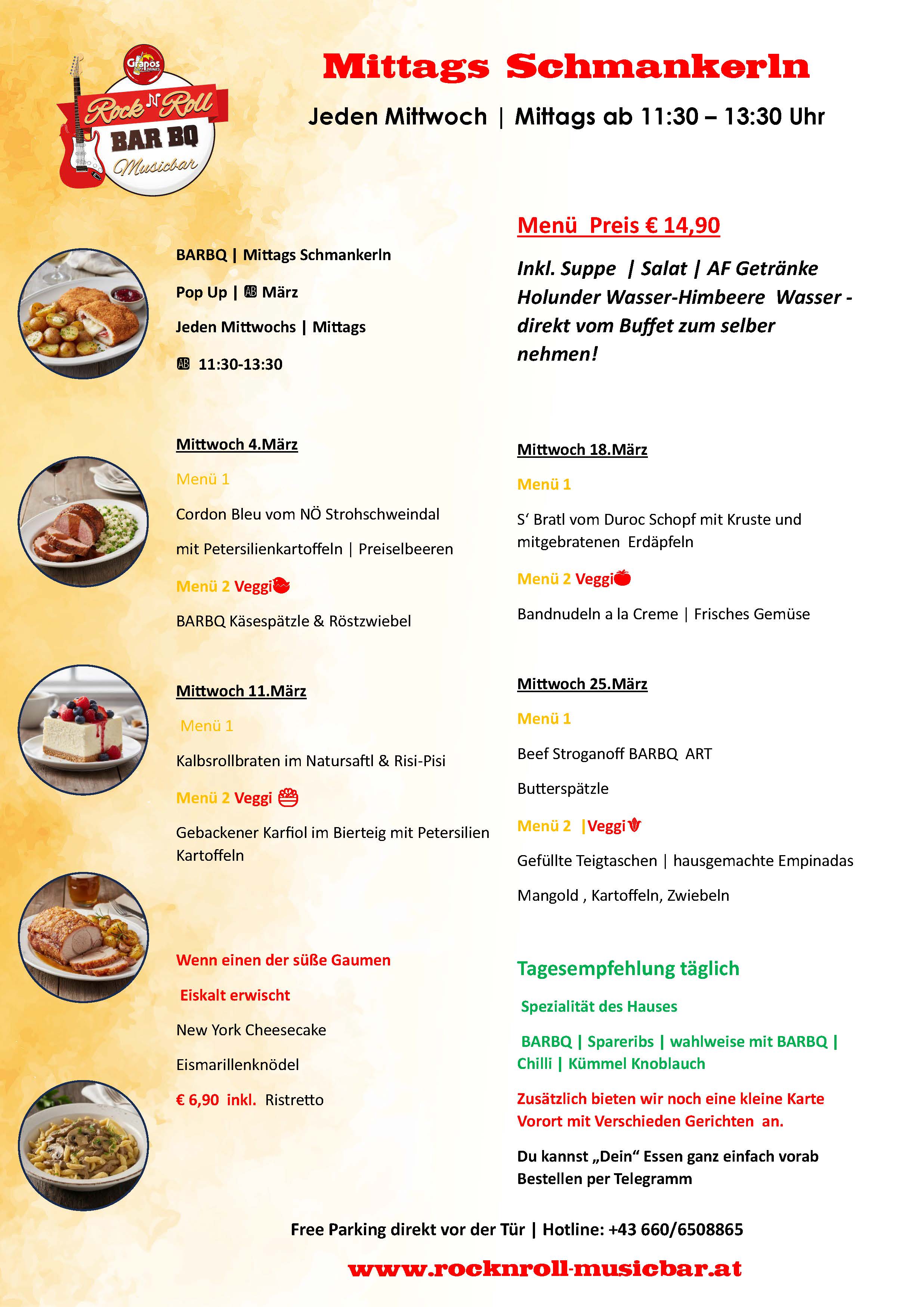Das Rock N Roll | Bar BQ – Musicbar zeichnet sich nicht nur durch gutes Essen, sondern auch durch seine einzigartige Atmosphäre aus. Musikklassiker aus den 80ies, 90ies, Rock, Pop, Austro Pop und aktuelle Hits sorgen für musikalische Unterhaltung. Im Sommer können Sie unse Spezialitäten auch in unserem gemütlichen Gastgarten genießen.